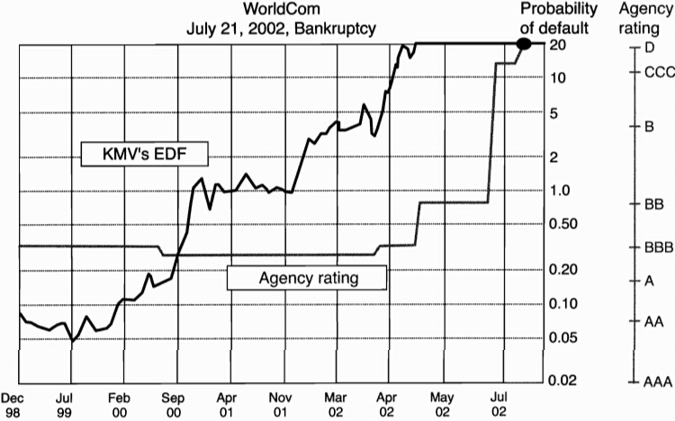 the KMV approach: the company sells expected default frequencies (EDFs) for global firms